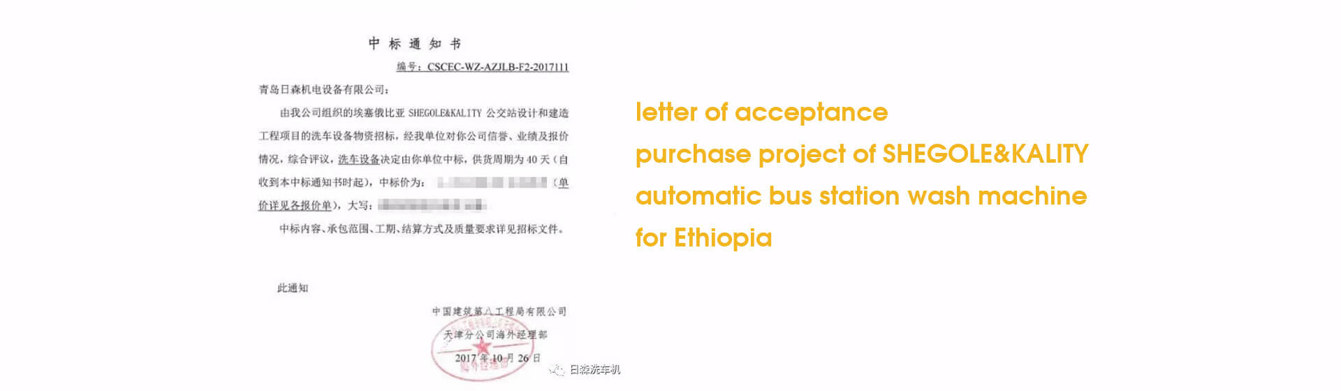 The letter of acceptance of the purchase project of SHEGOLE&KALITY; of automatic bus station wash machine for Ethiopia from China Construction Eighth Engineering Division Co., Ltd.