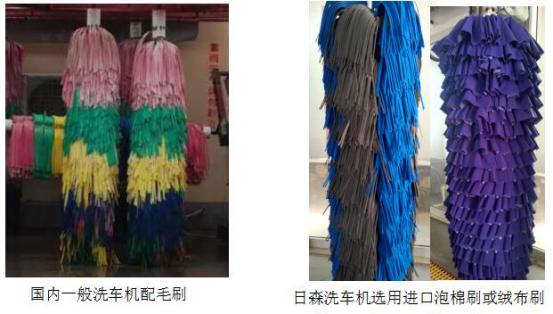 ????日森全自動(dòng)洗車機(jī)在刷子材質(zhì)上一直選用進(jìn)口泡棉材質(zhì),抗老化能力強(qiáng),洗10萬輛車還能保證質(zhì)地柔軟。絨布刷為進(jìn)口高織棉,洗凈度更高。