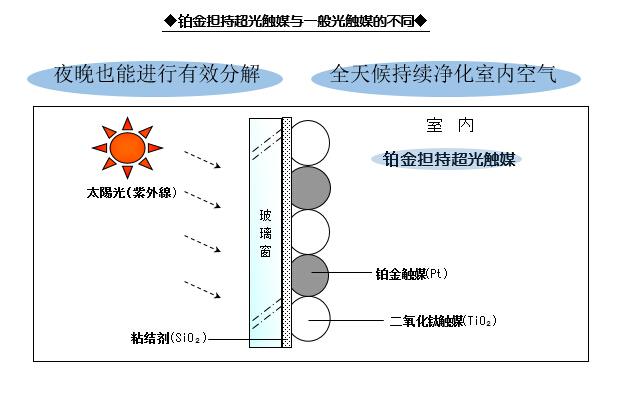 涂上空氣戰(zhàn)略鉑金擔(dān)持超光觸媒后、玻璃表面上附著著由二氧化鈦觸媒和鉑金觸媒組成的[鉑金二氧化鈦超光觸媒]以及使其固定在玻璃上的粘結(jié)劑。鉑金擔(dān)持超光觸媒通過(guò)太陽(yáng)光中紫外線的照射,充分達(dá)到分解效果。所以將其涂抹于太陽(yáng)光照射量最多的玻璃上時(shí),能使其達(dá)到最大的分解效果。鉑金擔(dān)持超光