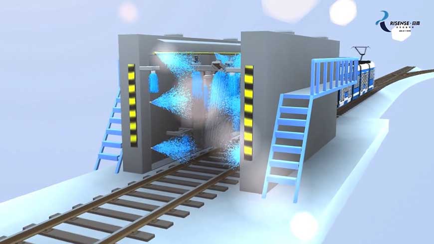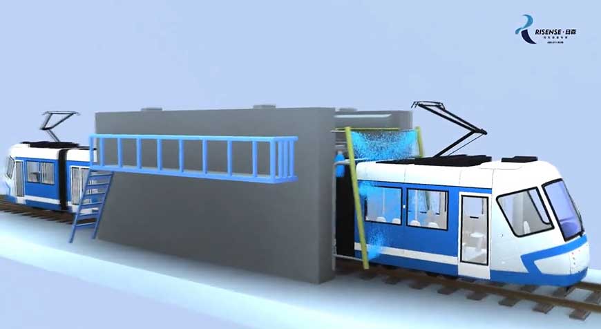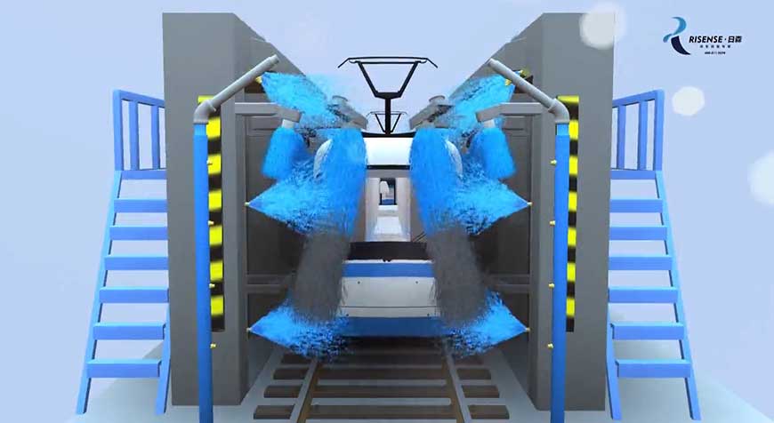 3、增加了清洗車頭和車尾的功能。我公司針對城軌電車的頭-尾的流線外形,設計了仿形清洗技術。